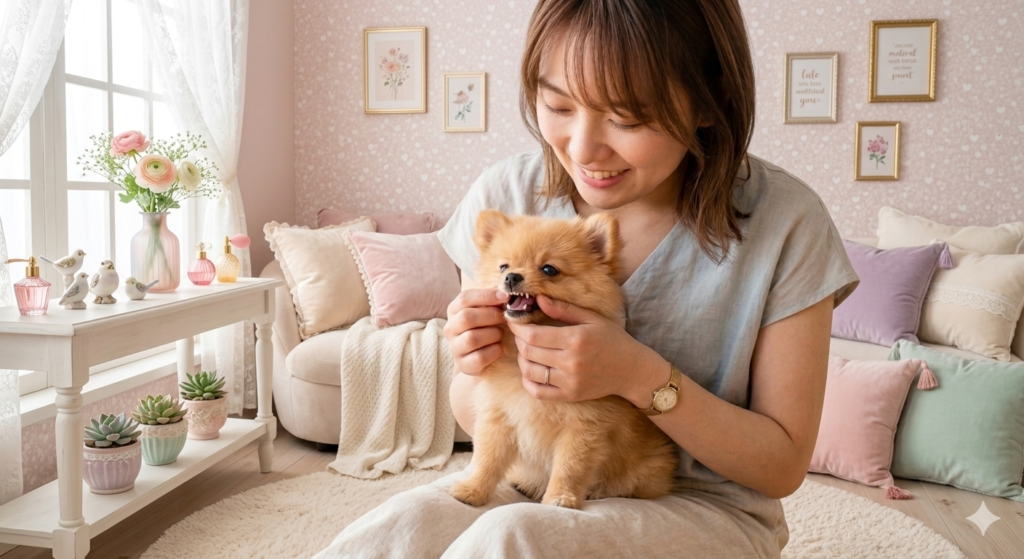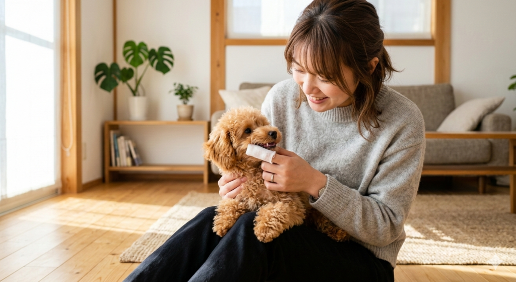 パピーを迎えて新しい環境に慣れてきたらできるだけ早めに始めましょう。幼いうちから始めれば、歯ブラシに味がついていなくても、嫌がらない子が多いのではないでしょうか。
