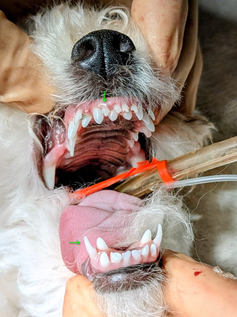 ちょうどお家に迎えたころ、パピーは数カ月齢が多いです。この時期、乳歯が生えています。これが人同様、徐々に永久歯に抜け替わっていきます。乳歯が抜けて、すき間が空いたり、穴が開いて出血したりしているのを発見することもあるでしょう。しかし、乳歯が抜けずその横に永久歯が生えてくることがあります。これを乳歯遺残といいます。