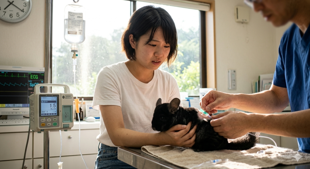 チンチラが半日以上食べない場合は命に関わるため、すぐに動物病院を受診し、原因治療、対症療法(強制給餌、内服)が必要です。