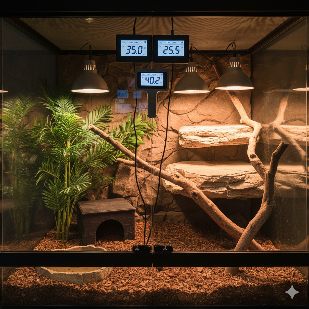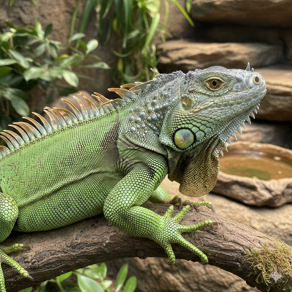 イグアナは変温動物であり、体温維持は完全に環境依存です。適切なホットスポット(35℃前後)とクールエリア(28℃前後)の温度勾配を作りつつ、夜間も極端に温度を下げない設計が必要です。大型ケージではヒーター容量が不足しやすく、保温設備の過小評価が慢性的な代謝不全、ひいては体調不良を招きます。