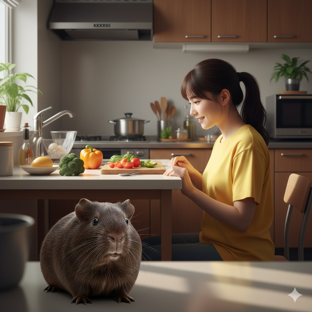 ビタミンCを含むペレットと新鮮な野菜と牧草が欠かせません。食事が偏ると免疫力が低下し、感染症のリスクが高まります。