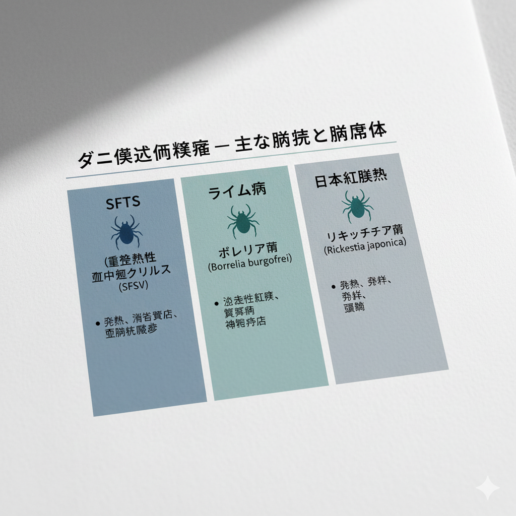 | 重症熱性血小板減少症候群(SFTS) | SFTSウイルス(ブニヤウイルス) | 発熱、消化器症状、血小板減少、致死率高い | 対症療法(特効薬なし) |